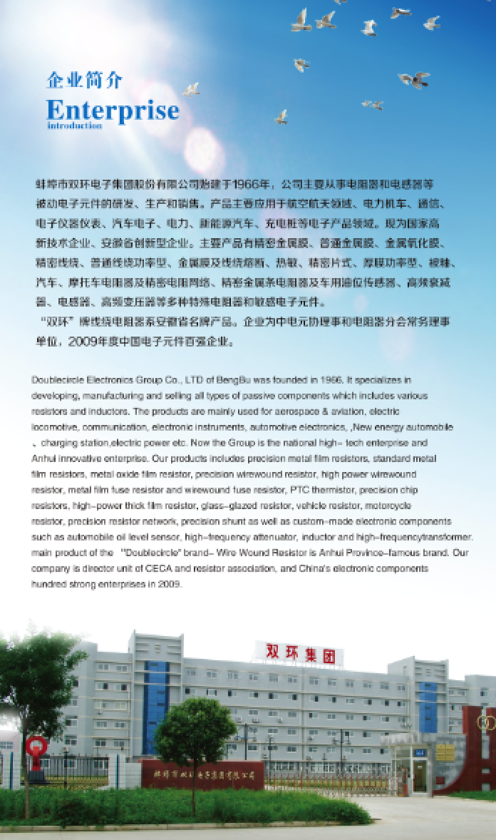 蚌埠市雙環(huán)電子集團(tuán)股份有限公司(貝迪斯電子有限公司、安徽省昌盛電子有限公司、蚌埠市偉創(chuàng)遠(yuǎn)東電子有限公司、蚌埠市雙環(huán)電感股份有限公司、德國(guó)SRT公司、淄博智捷電子科技有限公司)立足軍工航空航天、工業(yè)控制與鐵路機(jī)車、新能源汽車與充電樁、通訊電子及環(huán)保節(jié)能等市場(chǎng)領(lǐng)域,50余年專注電阻器、電感器、直流高壓繼電器及相關(guān)電子元器件的研發(fā)與制造,以組合產(chǎn)品配套服務(wù)于市場(chǎng)客戶,以軍工品質(zhì)設(shè)計(jì)理念、參與客戶產(chǎn)品設(shè)計(jì)與質(zhì)量服務(wù)為立足點(diǎn),為客戶創(chuàng)造價(jià)值,實(shí)現(xiàn)公司的穩(wěn)健發(fā)展。