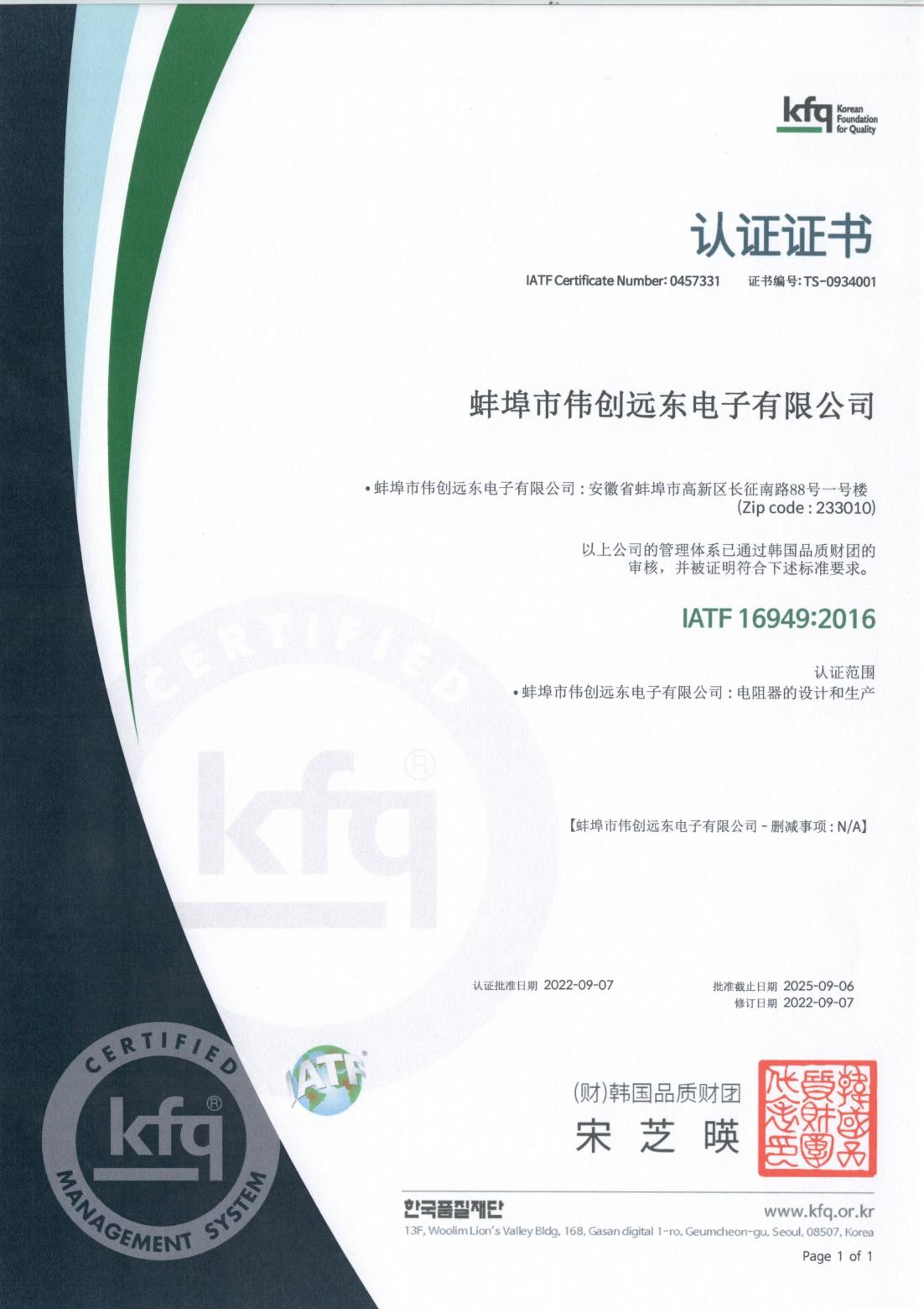 蚌埠市偉創(chuàng)遠東電子有限公司通過IATF16949質(zhì)量管理體系認證